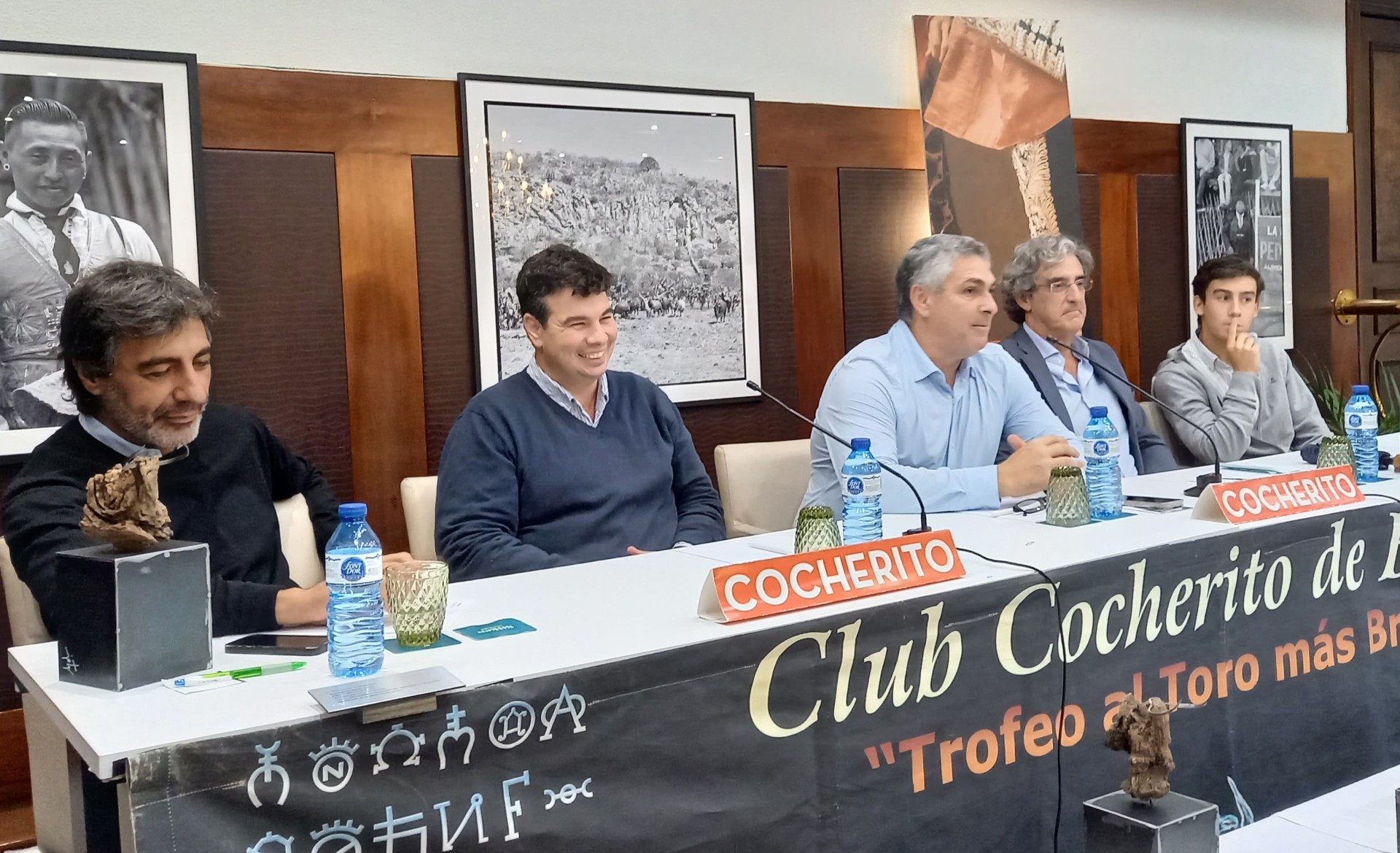 Cuarto coloquio vespertino del Club Cocherito en la Semana Grande de Bilbao, tras una corrida en la que Roca Rey cortó tres orejas y en la que el quinto toro de la tarde (de Victoriano del Río) fue premiado con la vuelta al ruedo en el arrastre. Comparecieron para hablar de toros y valorar la corrida Fernando Gomá, representante de la Fundación Toro de Lidia; Gonzalo Bienvenida, periodista que cubre la presente edición de las Corridas de Generales para el diario “El Mundo” y es comentarista habitual en diferentes programas, entre ellos “El Séptimo Toro”, de Radio Intereconomía; y Juan del Val, escritor, colaborador de televisión y aficionado taurino. Junto a ellos, el joven novillero cordobés Manuel Quintana que, a la postre, tras la final celebrada el viernes, resultaría triunfador del Memorial Iván Fandiño. Condujo el coloquio Álvaro Suso, miembro de la Junta Directiva del decano de los clubes taurinos. Nuevamente, el salón del hotel Silken Indautxu presentó un lleno total.