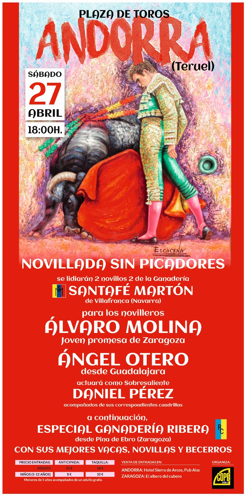 El próximo día 27 de abril, con motivo de la celebración de la feria de abril de la casa Andalucía en la localidad de Andorra (Teruel), la empresa Espectáculos Cope ha organizado una novillada sin picadores seguida de un festejo popular que no dejará indiferente a nadie.