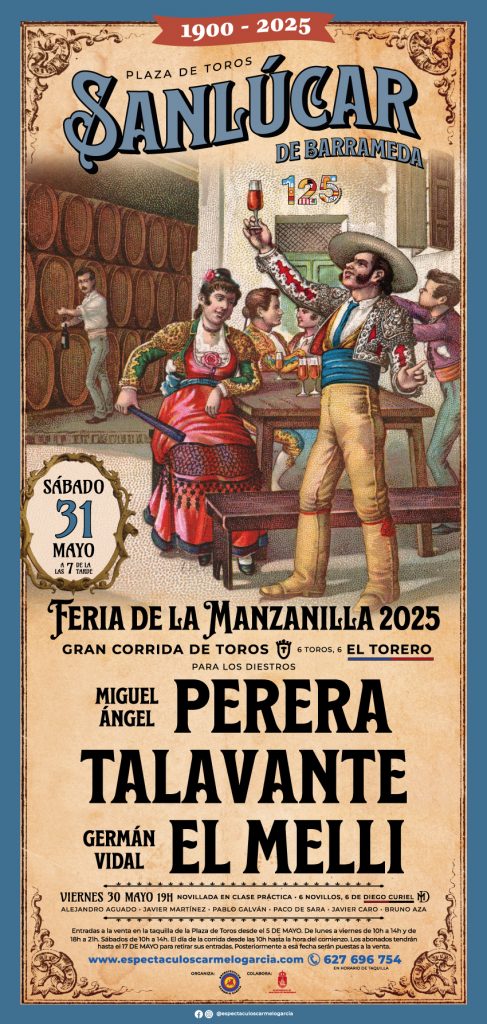 La terna de matadores para la corrida de toros, programada para el sábado 31 de mayo, está integrada por Miguel Ángel Perera, Alejandro Talavante y Germán Vidal ‘El Melli’, que lidiarán un encierro de la ganadería de El Torero. Se trata de una cita clásica y tradicional en el calendario taurino, que además este año se enmarca en la celebración del 125 Aniversario del ‘Coso del Pino’. Para esta efeméride la empresa ha querido tomar para la imagen del cartel una etiqueta de vino del marco de Jerez de principios del Siglo XX, época de la inauguración de la plaza de toros sanluqueña.