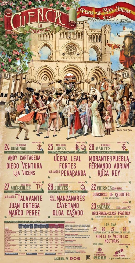 La Feria de San Julián 2025 se desarrollará del 22 al 28 de agosto y contará con festejos para todos los gustos: recortadores, rejoneo, corridas de toros con figuras consagradas y jóvenes promesas, además de una novillera acartelada con toreros de renombre. Las suelta de vaquillas nocturnas también tendrán su espacio los días 23, 26, 27 y 28.