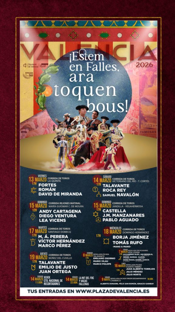 El cartel anunciador, bajo el lema “Estem en Falles, ara toquen bous!”, refleja el espíritu de la cita valenciana, uniendo tradición y actualidad: un ruedo suspendido en el tiempo donde conviven los ecos históricos del coso con los toreros que protagonizarán la feria. Rafael García Garrido, director general de Espacios Nautalia 360, destacó la renovación y la ilusión de la feria: “Si tuviera que poner un titular a estas Fallas 2026 no dudaría en llamarla la feria de la ilusión”, afirmó.