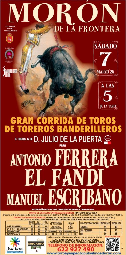 La empresa Toros y Espectáculos Hnos. Durán ha hecho público que la plaza de Morón de la Frontera abrirá sus puertas el 7 de marzo para acoger una corrida de toreros banderilleros, uno de los formatos más llamativos del inicio de temporada. El cartel reúne a tres matadores con amplia trayectoria en el manejo de los palos: Antonio Ferrera, David Fandila ‘El Fandi’ y Manuel Escribano.