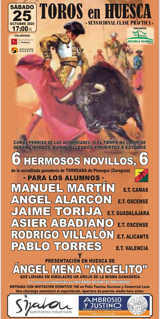 La plaza de toros de Huesca acogerá el próximo sábado 25 de octubre una clase práctica taurina organizada por la Escuela Taurina Oscense, con el apoyo del Ayuntamiento y la Diputación Provincial. El festejo, que dará comienzo a las 17:00 horas, contará con la lidia de seis novillos de la ganadería Torreana, de Pinseque (Zaragoza).