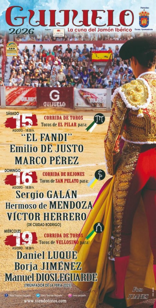 En el capítulo de toreros, los carteles reflejan un equilibrio entre figuras asentadas, nombres emergentes y perfiles estrechamente ligados a la afición local. Las repeticiones de Borja Jiménez y Manuel Diosleguarde responden al eco que dejaron sus actuaciones anteriores, mientras que la presencia de Daniel Luque viene a cumplir una asignatura pendiente con la plaza guijuelense.