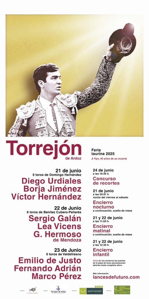 Garzón ha dado a conocer junto al alcalde unos carteles de una feria que este año está dedicada a José Cubero Yiyo, “el cartel de esta feria está dedicado al diestro madrileño en el 40 aniversario de su muerte, una gran figura del toreo con el sello de un torero clásico y puro. De ahí que desde Lances de Futuro le hagamos este homenaje con el cartel de esta feria de Torrejón”.