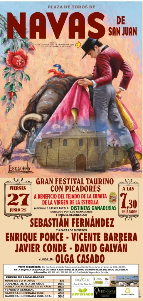 El municipio jiennense de Navas de San Juan ha presentado el cartel de su esperado festival taurino con picadores, que se celebrará el próximo 27 de junio con un doble objetivo: enmarcarse dentro de la feria y fiestas en honor a San Juan Bautista y colaborar con una noble causa, destinándose los beneficios a la restauración del tejado de la Ermita de la Virgen de la Estrella.