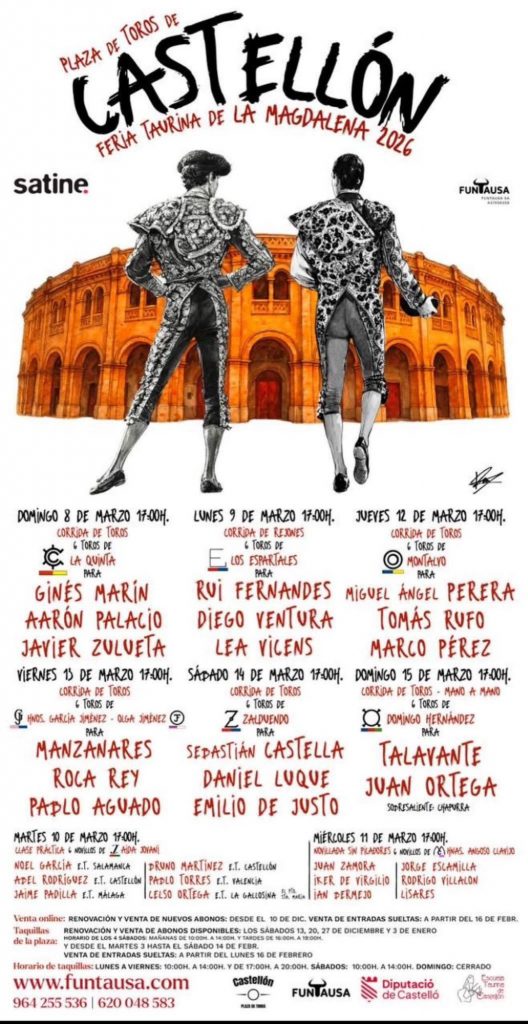 La empresa Funtausa presentó, en el Casino Antiguo y antes de las fiestas navideñas, los carteles de la Feria de la Magdalena de Castellón 2026, un ciclo que apuesta por la combinación de figuras consagradas, toreros emergentes y ganaderías de primer nivel. El serial se desarrollará del 8 al 15 de marzo, con un programa compuesto por cinco corridas de toros, una corrida de rejones, una novillada sin picadores y una clase práctica.
