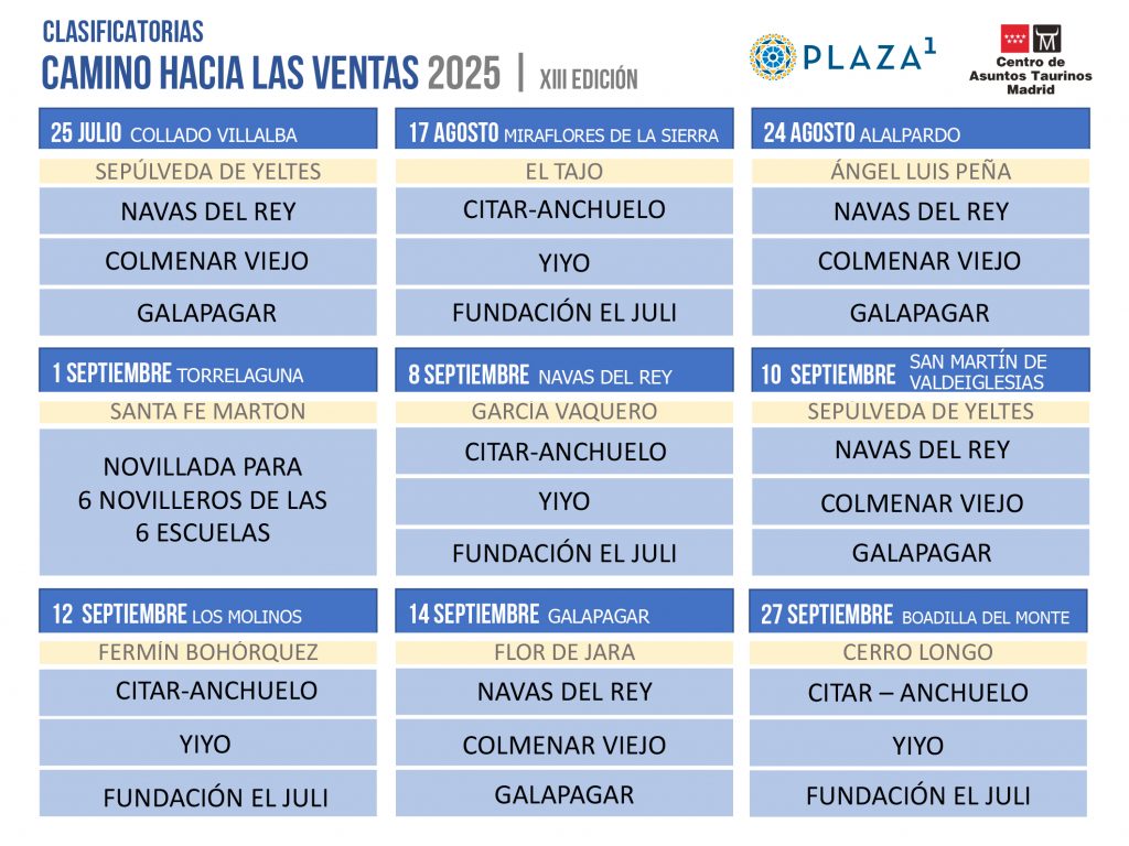 José Cubero ‘Yiyo’, Fundación El Juli, Citar – Anchuelo, Galapagar, Navas del Rey y Colmenar Viejo son las Escuelas participantes que cuentan con 5 puestos en el total de 9 novilladas clasificatorias. Como novedad, las novilladas clasificatorias pasan de 8 a 9, siendo la novillada adicional una cita con seis puestos, uno para cada escuela, que se celebrará en Torrelaguna.Collado Villalba, Miraflores de la Sierra, Alalpardo, Navas del Rey, San Martín de Valdeiglesias, Los Molinos, Galapagar y Boadilla del Monte acogerán las clasificatorias con ternas en su cartel. Los tres finalistas buscarán el triunfo final en el mes de octubre en una cita encuadrada dentro de la Feria de Otoño en Las Ventas.
