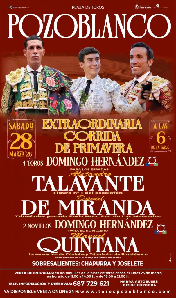 La localidad cordobesa de Pozoblanco acogerá el próximo 28 de marzo, Sábado de Pasión, una corrida de toros que dará comienzo a las 18:00 horas, en un festejo organizado por la empresa Caído y Soledad, dirigida por Antonio Tejero, que ha configurado un cartel marcado por la apuesta decidida por el presente y el futuro de la tauromaquia.