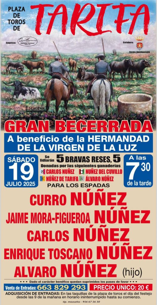El próximo sábado 19 de julio de 2025 a las 19:30 h, la plaza de toros de Tarifa acogerá una gran becerrada benéfica a favor de la Hermandad de la Virgen de la Luz, patrona de la localidad.