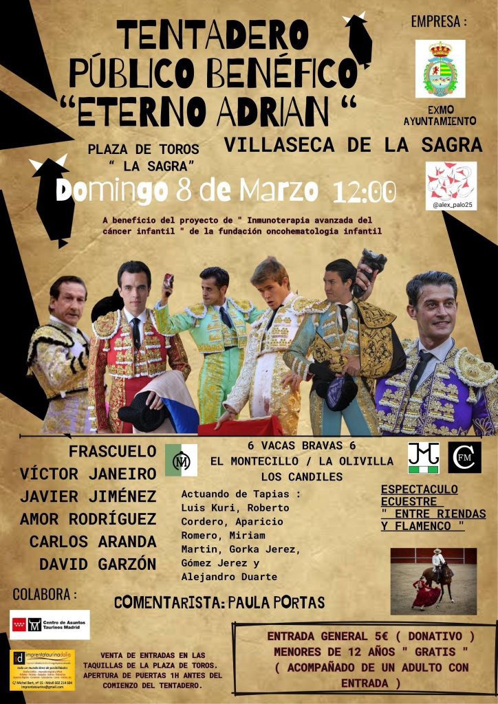 Villaseca de la Sagra volverá a convertir la tauromaquia en vehículo de cultura y solidaridad el próximo domingo 8 de marzo de 2026 con la celebración del Tentadero Benéfico y la Gala “Eterno Adrián”, una cita promovida a favor de la investigación contra el cáncer infantil que se ha consolidado como uno de los eventos más sensibles y significativos del municipio.