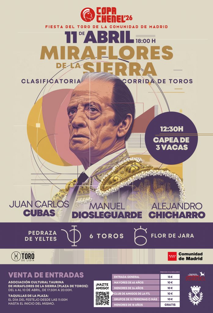 La Copa Chenel 2026 celebra este sábado en Miraflores de la Sierra su segunda clasificatoria, con toros de Pedraza de Yeltes y Flor de Jara para Juan Carlos Cubas, Manuel Diosleguarde y Alejandro Chicharro, tres toreros que llegan con el objetivo claro de abrirse paso en el certamen.
