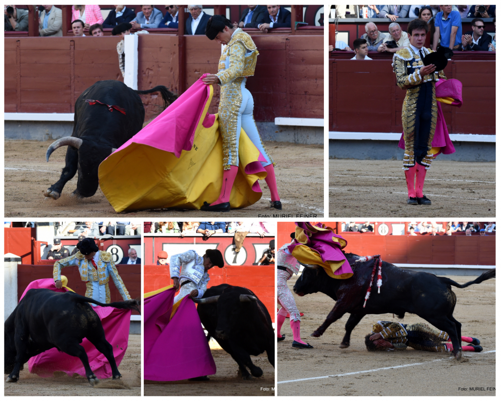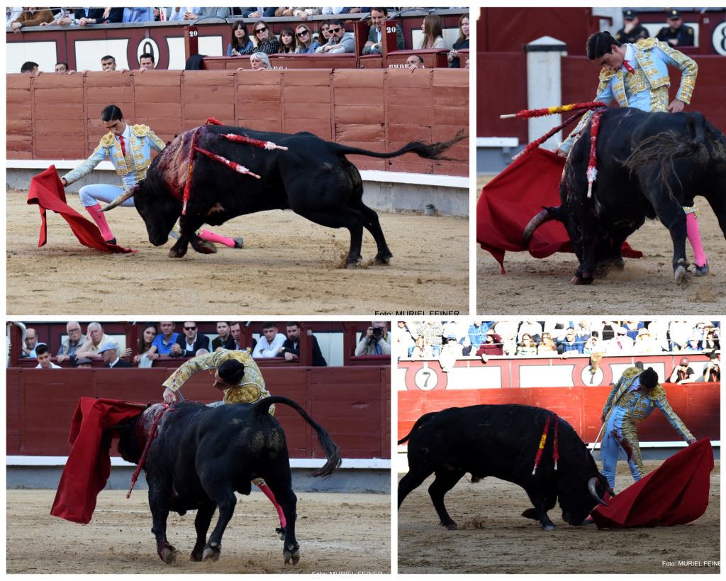 ‘Entrenador’ salió en segundo lugar y fue recibido por El Mene con un variado saludo capotero, en el que combinó verónicas y chicuelinas, rematando con dos medias en los medios. Tomás Bastos intervino con un quite por tafalleras, bien ejecutadas y con la suerte cargada, cerrando con una media ralentizada de gran estética. El Mene replicó con unas chicuelinas vistosas, que concluyó con una media muy ovacionada. Brindó la faena al público y comenzó flexionándose con el novillo y doblándose con él en los primeros compases. El Mene mostró una actitud firme y decidida, dejando pasajes de buen trazo que evidenciaron su compromiso con la plaza de Madrid. Culminó su labor con un estocadón en todo lo alto.
