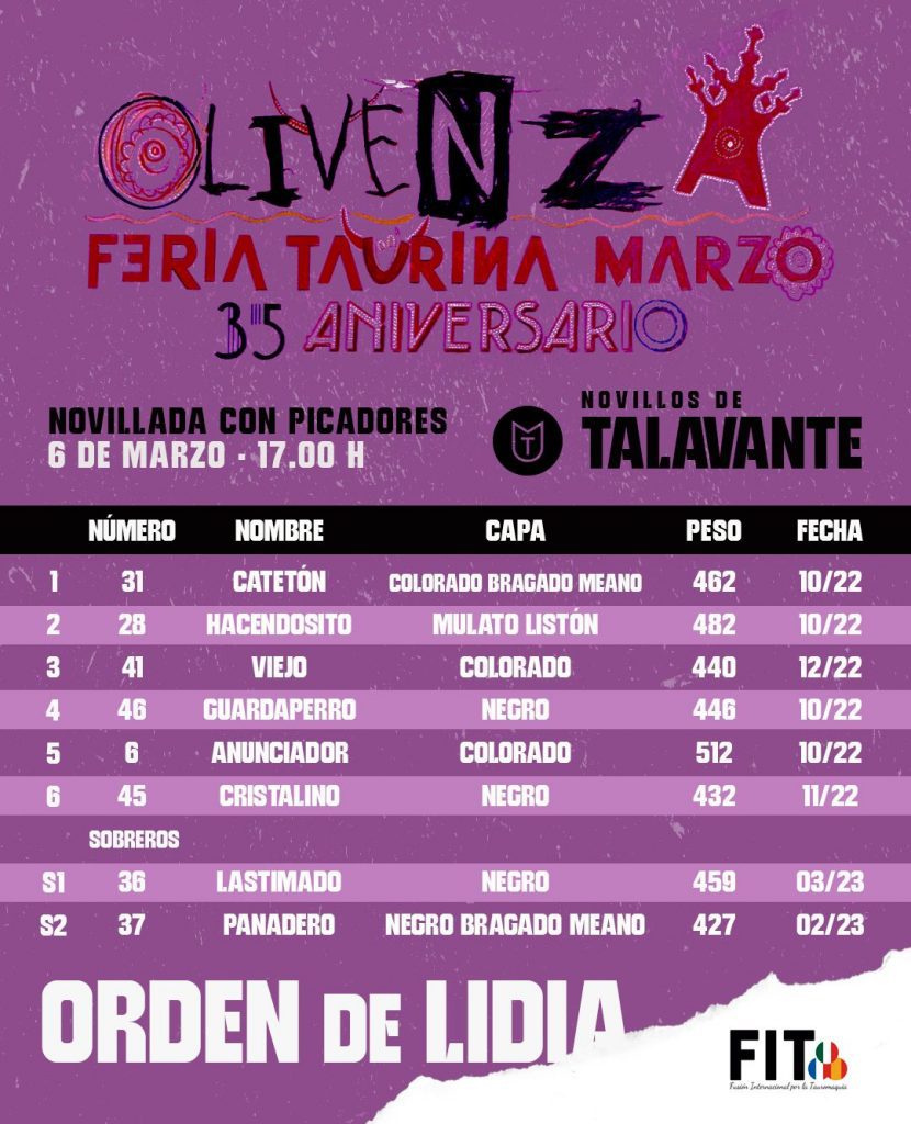 Los novillos de la ganadería de Talavante ya han sido sorteados y enchiquerados para la novillada que este viernes dará comienzo a la Feria de Olivenza. El festejo arrancará a las 17:00 horas.