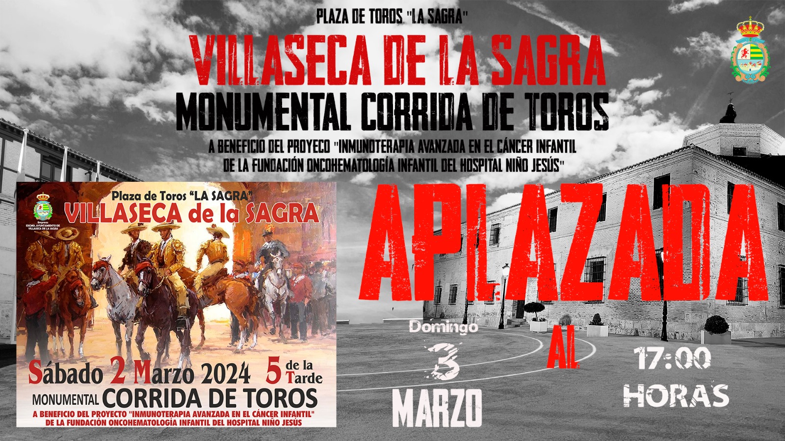 toros benéfica prevista para ese mismo día en la plaza de toros de La Sagra en Villaseca de la Sagra, se aplaza para el domingo día 3 de marzo a las 17:00 horas.