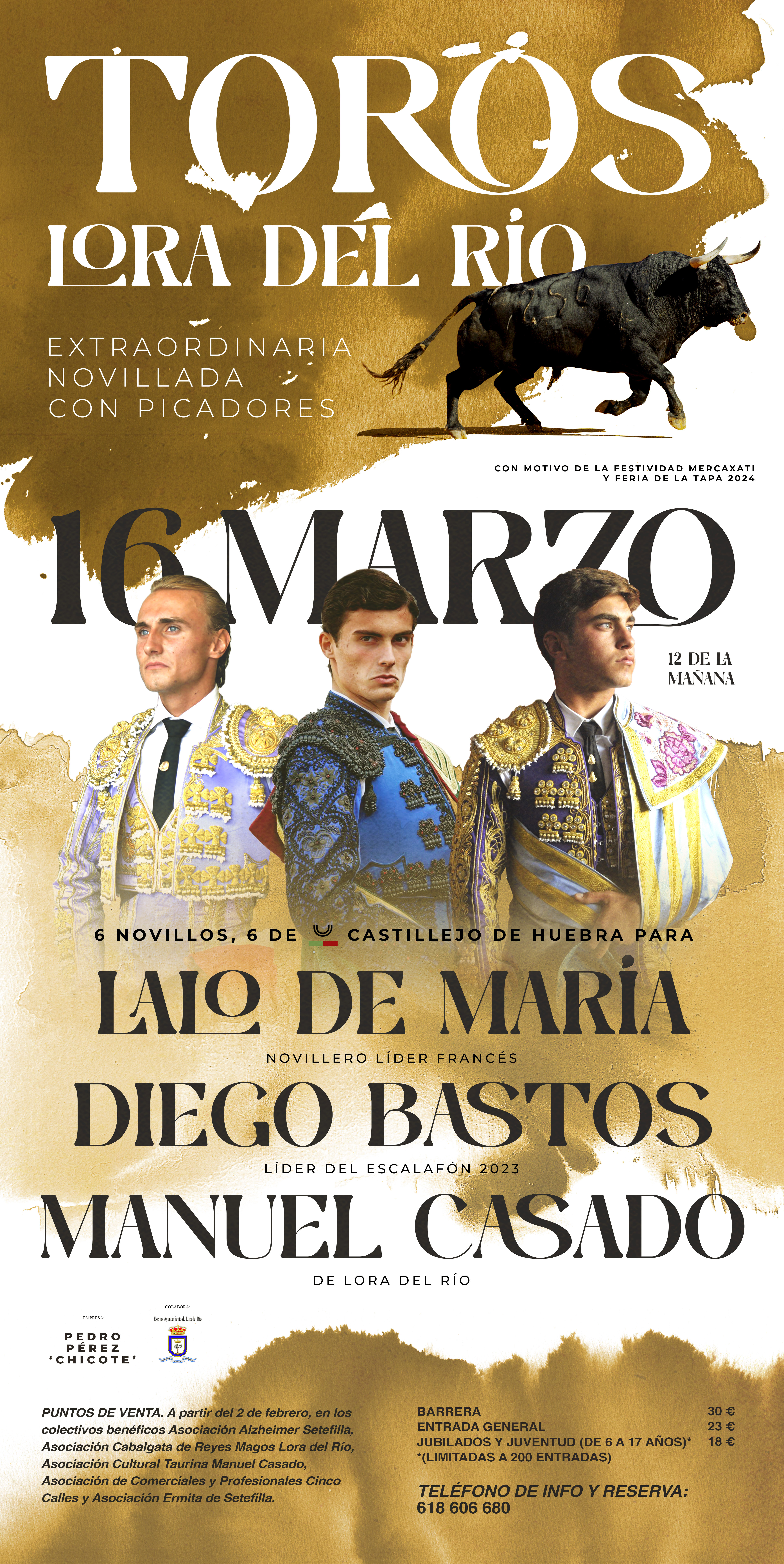 Este festejo pasa al sábado 16 de marzo con el mismo cartel: Lalo de María, Diego Bastos y Manuel Casado con novillos de Castillejo de Huebra. El festejo será matinal y dará comienzo a las 12.00 h.