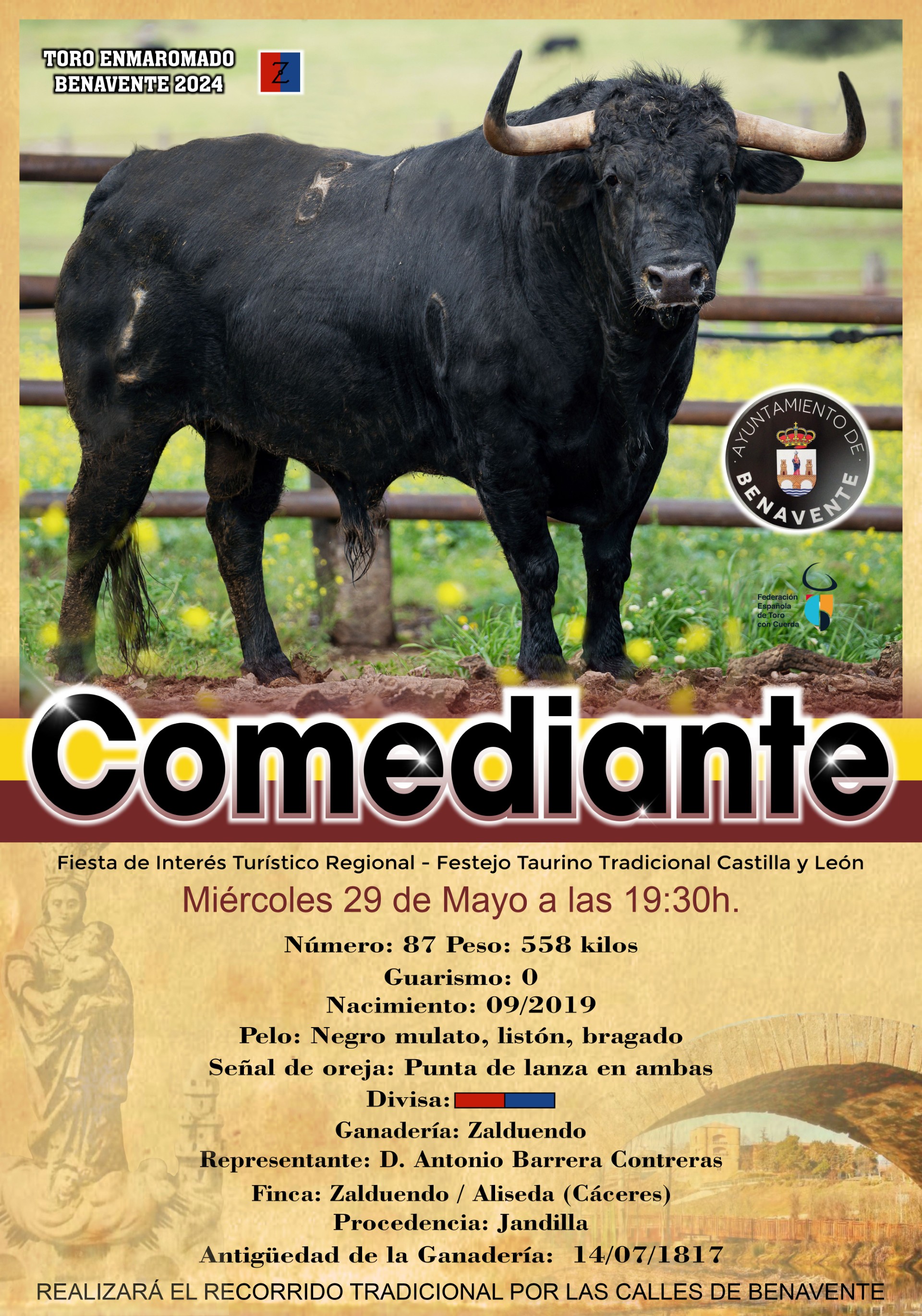 El festejo taurino del Toro Enmaromado de Benavente que se celebra tradicionalmente el miércoles de la Semana del Corpus Christi, se encuentra amplia y suficientemente documentado en el archivo municipal de Benavente, teniendo por tanto una antigüedad superior a 500 años. A las 19:30 horas, tal y como marca la tradición, y después de los correspondientes avisos, Comediante realizará su salida desde el toril municipal para ser guiado y respetado por los corredores a lo largo de un recorrido con una longitud de 2,8km.