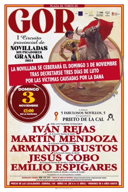 La novillada sin picadores en Gor (Granada), inicialmente prevista para el sábado 2 de noviembre, se celebrará el domingo 3 de noviembre debido a la tragedia ocasionada por la DANA y al decreto de tres días de luto oficial. La hora y el cartel se mantienen: el festejo comenzará a las 12:00 h y contará con los novilleros Iván Rejas, Martín Mendoza, Armando Bustos, Jesús Cobo y Emilio Espigares, quienes lidiarán novillos de la ganadería de Prieto de la Cal.