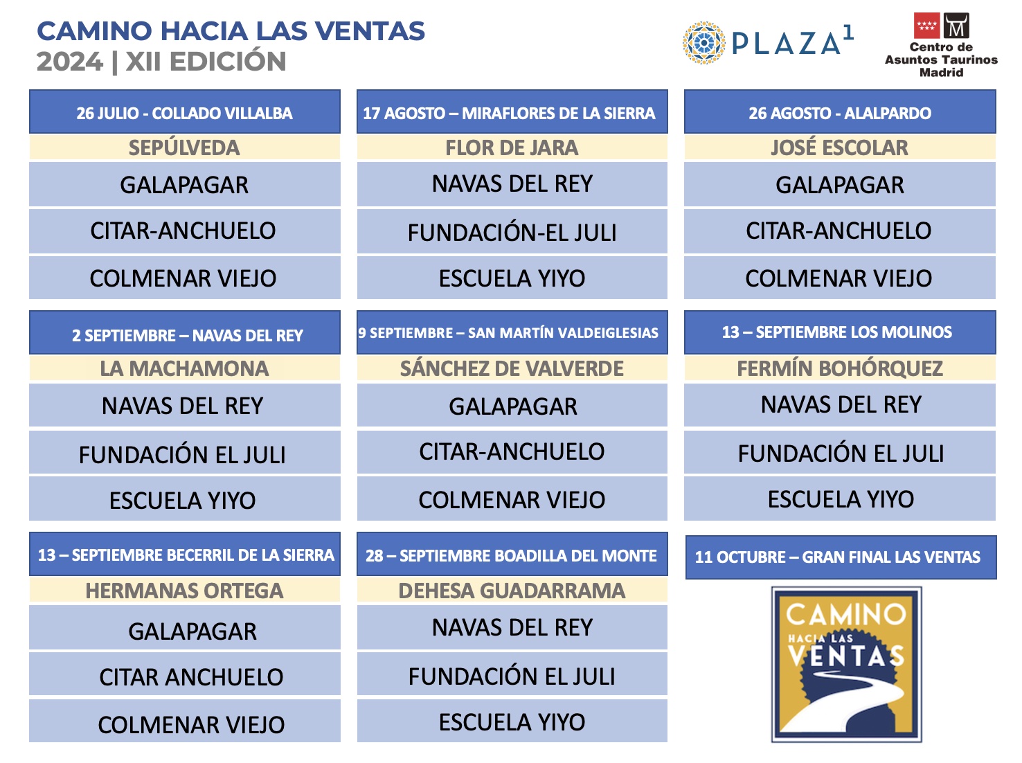 José Cubero ‘Yiyo’, Fundación El Juli, Citar – Anchuelo, Galapagar, Navas del Rey y Colmenar Viejo son las Escuelas participantes que cuentan con 4 puestos en el total de 8 novilladas clasificatorias. Los tres finalistas buscarán el triunfo final en el mes de octubre en una cita única dentro de la Feria de Otoño en las Ventas.