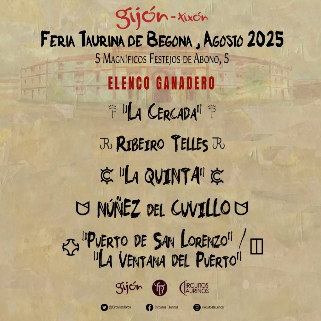 Entre las ganaderías confirmadas se encuentran La CercadaRibeiro TellesLa QuintaNúñez del CuvilloPuerto de San Lorenzo y La Ventana del Puerto. Estas ganaderías aportarán los toros que serán lidiados durante los cinco festejos en el bastión asturiano.