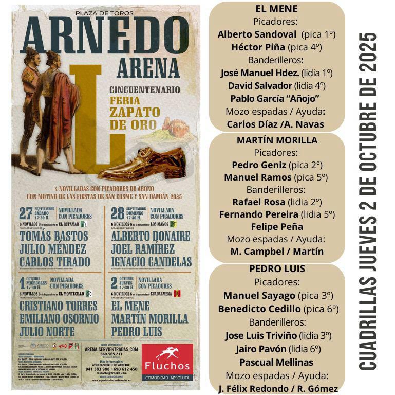 El festejo arrancará a las 17:30 horas y contará con la presencia en el ruedo de El Mene, Martín Morilla y Pedro Luis, encargados de poner el broche final a una feria que ha vuelto a convertir a Arnedo en epicentro del escalafón novilleril.