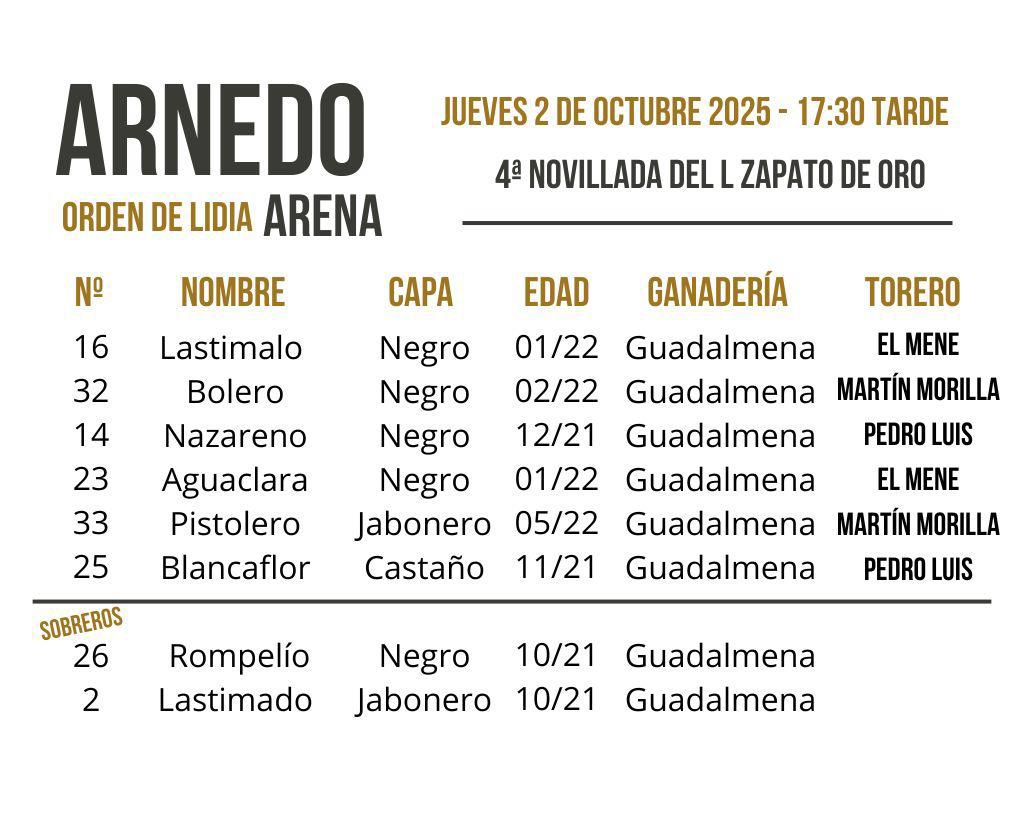 El ‘Zapato de Oro’ de Arnedo afronta este jueves su jornada de clausura con la cuarta novillada del certamen. Para la ocasión se ha reseñado un lote de Guadalmena, cuyos astados ya se encuentran sorteados y enchiquerados en la plaza riojana.
