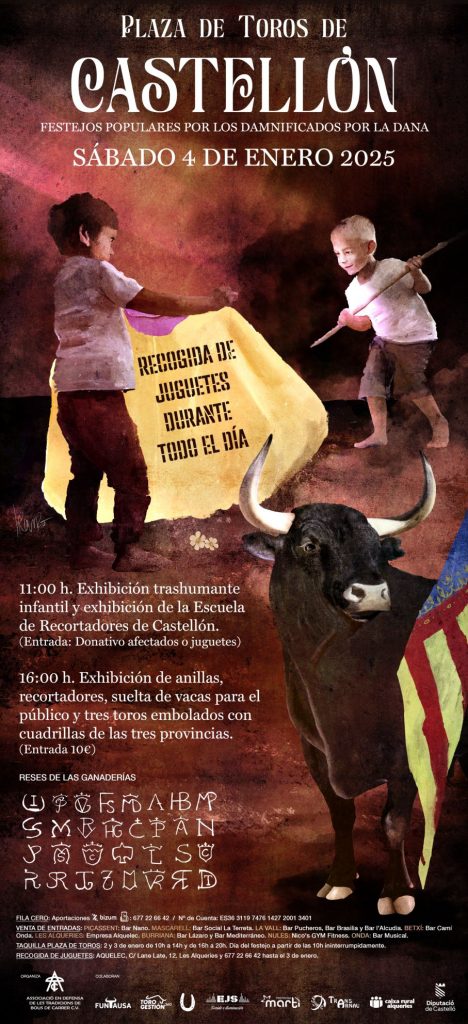 La Associació en Defensa de les Tradicions de Bous al Carrer de la Comunitat Valenciana convoca a los aficionados taurinos el próximo sábado 4 de enero en la Plaza de Toros de Castellón para una jornada benéfica destinada a ayudar a los damnificados por la DANA en la Comunidad Valenciana.