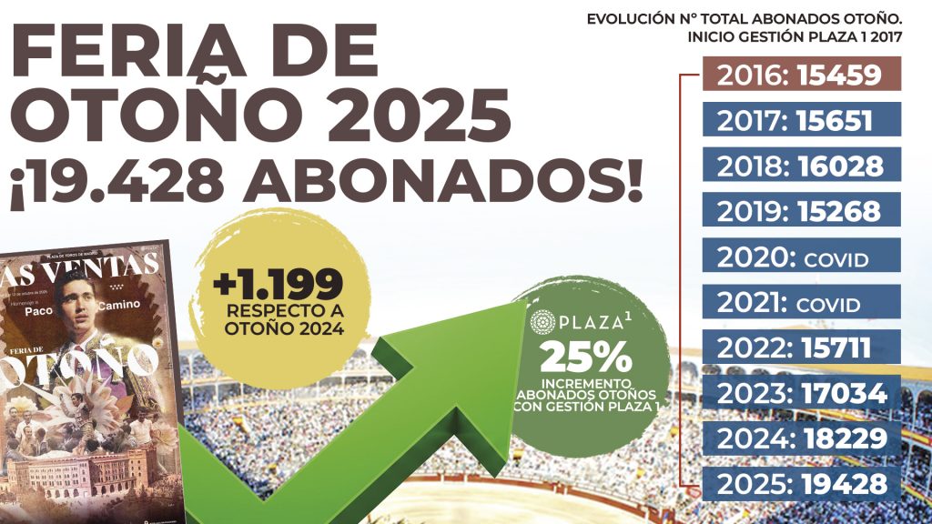 El aumento de abonados de la Feria de Otoño a partir de la gestión de Plaza 1 ha sido de casi 4000 abonados totales más. Lo que supone un aumento porcentual de más de un 25% desde la temporada del año 2016. (Ver cuadro informativo adjunto por año)