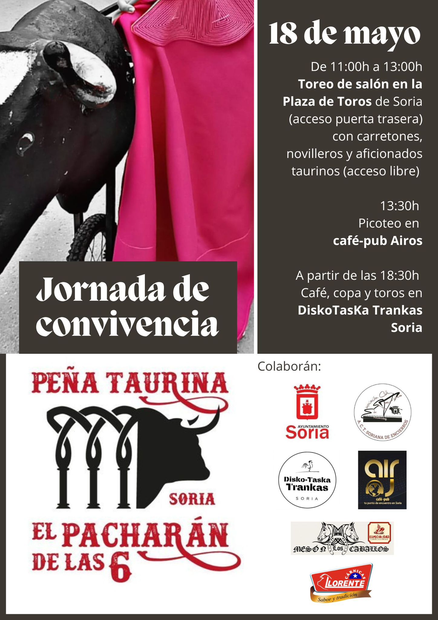 La peña taurina «El Pacharán de las 6» de Soria, ha organizado una jornada de convivencia el próximo sábado 18 de mayo que comenzará a las 11:00 de la mañana con una clase de toreo de salón en la misma plaza de toros de Soria que se extenderá hasta las 13:00.