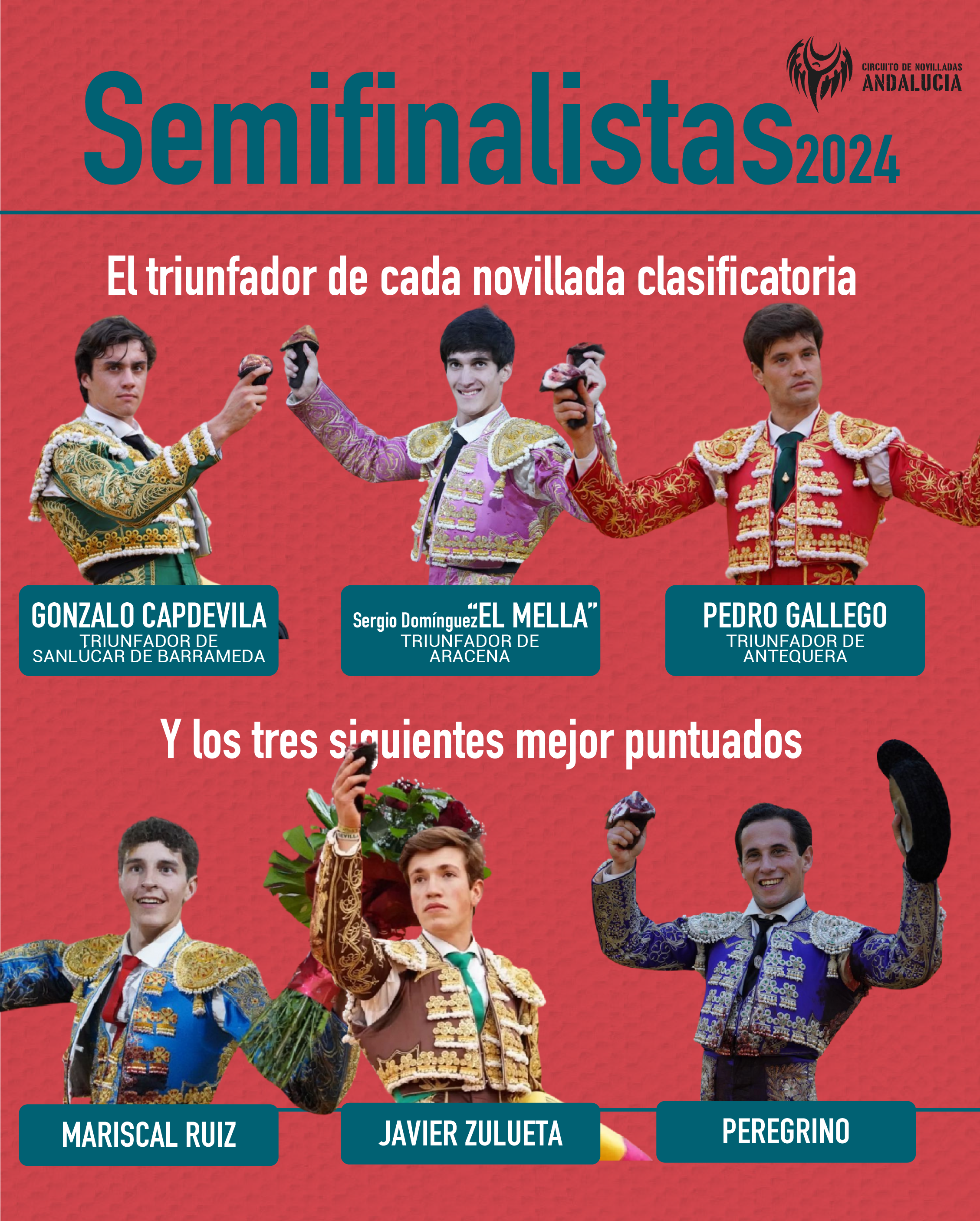 Además de los triunfadores de cada novillada, se clasifican también para semifinales los tres novilleros siguientes con mayor puntuación. Ellos son: Mariscal Ruiz (21,54 puntos), Peregrino (20,32 putnos) y Javier Zulueta (18,52 puntos). El martes en la sede de la Fundación Caja Rural del Sur, a las 12:30 horas, tendrá lugar el sorteo de las semifinales del Circuito que serán el próximo 20 de abril en Atarfe y el 27 de abril en Úbeda. La última cita del certamen, la gran final, se celebrará el 12 de mayo en la Real Maestranza de Caballería de Sevilla.