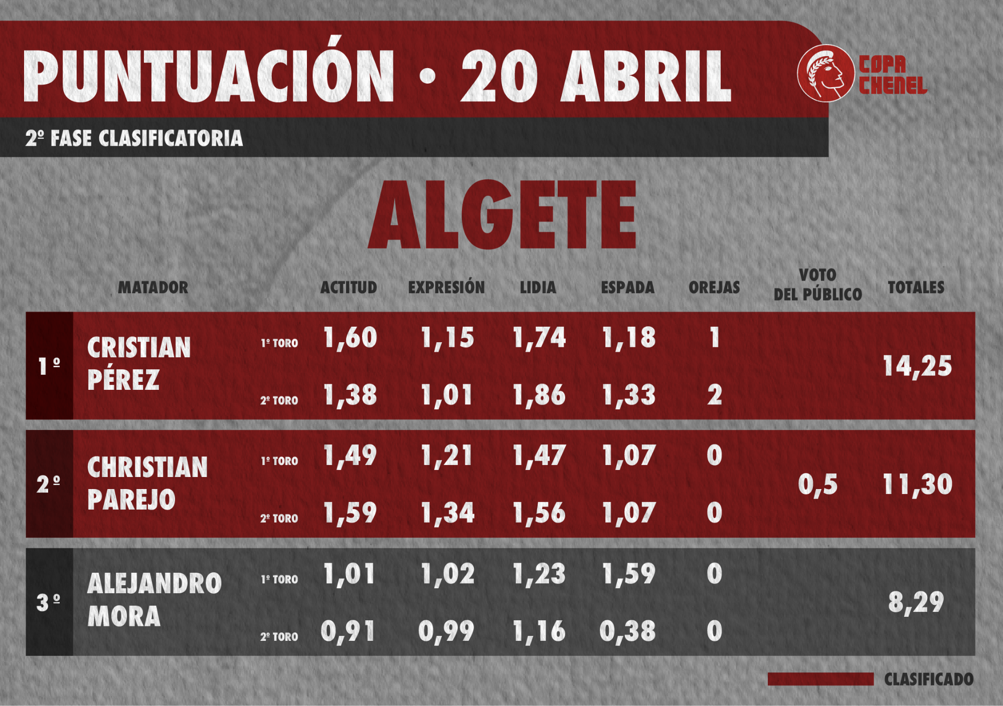 Las semifinales de la Copa Chenel cada vez están más cerca y de cada corrida de segunda fase se clasifican los dos mejor puntuados. De esta forma, Luis David Adame con 11,86 puntos y Rafael de Julia con 11,53 puntos son los clasificados de San Martín de Valdeiglesias. Además, Rafael de Julia se llevó el voto del público con un 45% de los votos, lo que ha sumado 0,5 puntos a la votación final. De esta forma Miguel Ángel Pacheco es el segundo eliminado de la segunda fase de la Copa Chenel, con 11,30 puntos.
