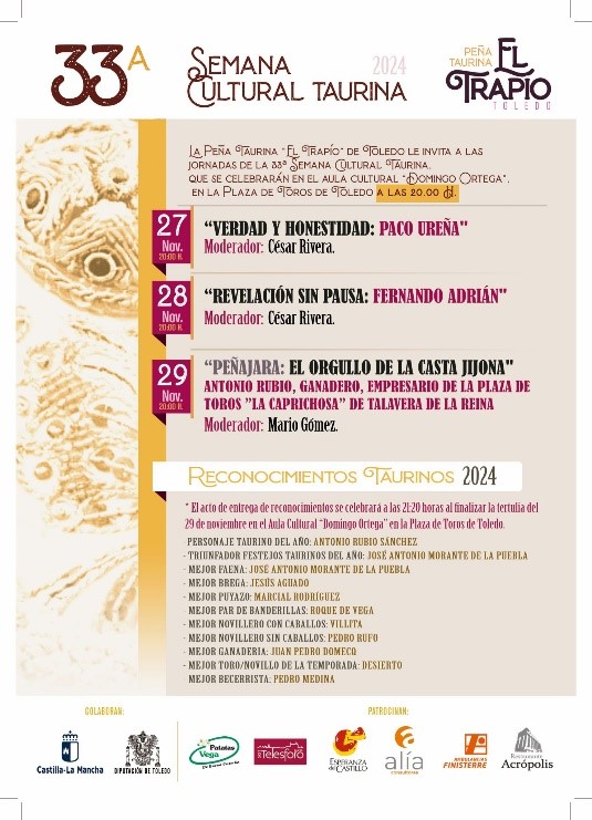 La Peña Taurina “El Trapío” de Toledo ha organizado una serie de coloquios con figuras destacadas del mundo taurino que tendrán lugar del 27 al 29 de noviembre, en un ambiente de análisis y reflexión sobre la actualidad taurina.