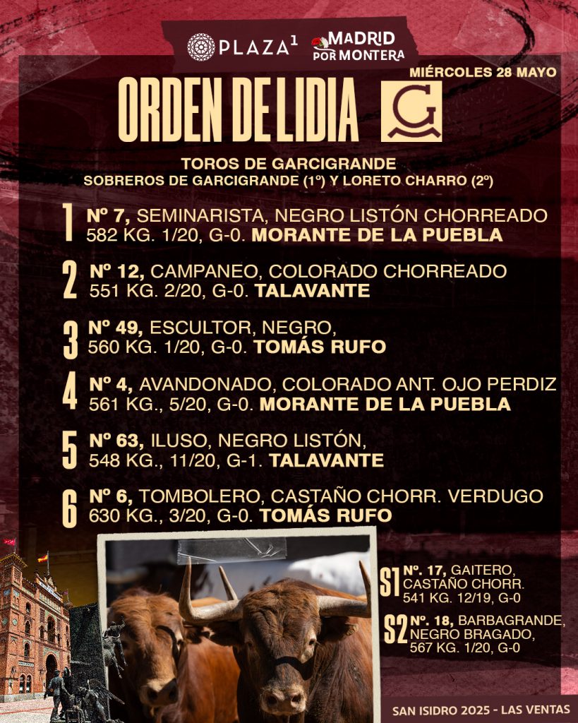 Sorteados y enchiquerados seis toros de Garcigrande para la decimoséptima de la Feria de San Isidro 2025, octava cita de ‘No Hay Billetes’.