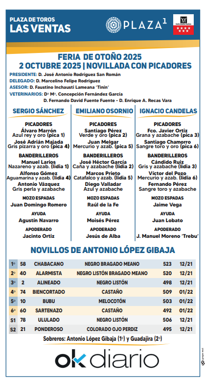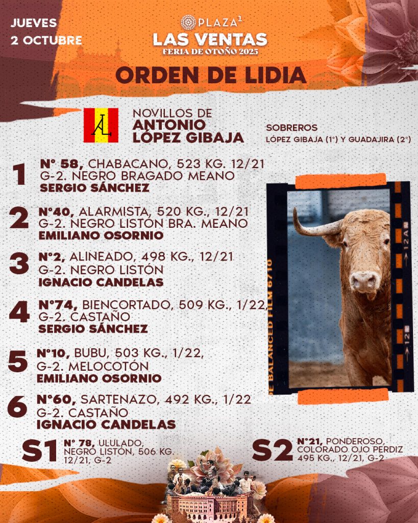 Seis novillos de Antonio López Gibaja ya han sido sorteados y enchiquerados para el primer festejo de la Feria de Otoño. Esta tarde, a las 18h., en la Plaza de Toros de Las Ventas serán lidiados por Sergio Sánchez, Emiliano Osornio e Ignacio Candelas.