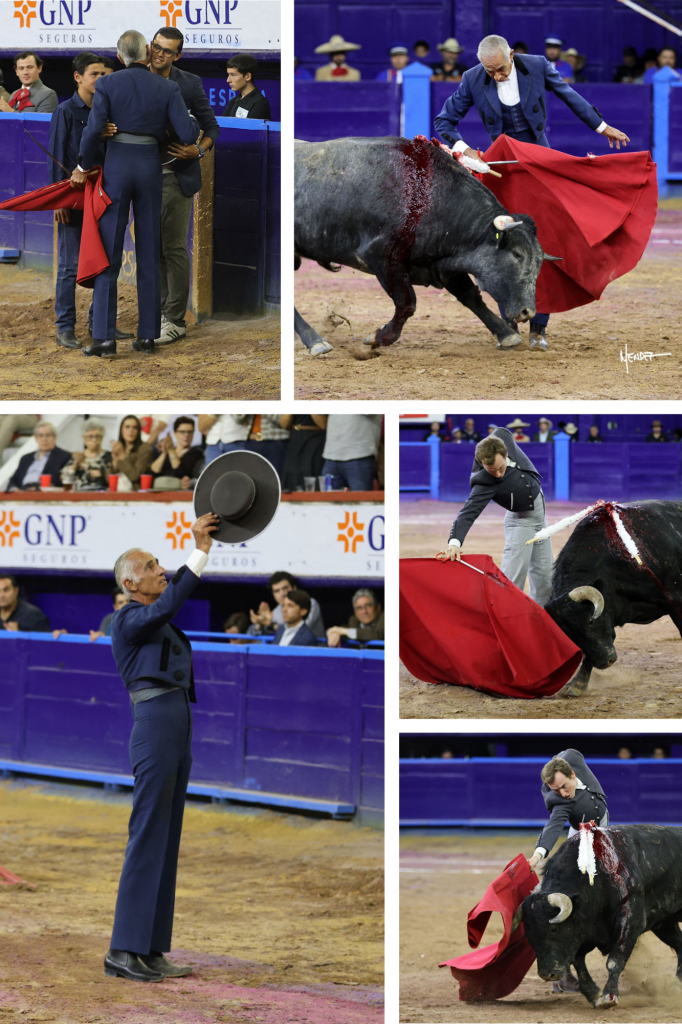 De vuelta al festival, el venezolano Jesús Enrique “Colombo”, al burel de Santa Inés, llamado “Empresario”, noble y con clase, lo recibió de rodillas, en tablas, con una larga cambiada y, de pie, lanceó a pies juntos y por una caleserina y, mejor quitó por navarras, rematando con la brionesa. Buena vara del piquero Héctor Cobos. Cubrió el espada tachirense el segundo tercio de forma espectacular, sobresaliendo un par al violín, para ser ovacionado. Con la pañosa, después de brindarle al matador retirado Arturo Macías, Jesús empezó en los medios, de hinojos, por derechazos, rematando de pie para seguir por el mismo lado atemperando, cautivando y mandando. Sus naturales tuvieron clase, estética, entendimiento y buen gusto, además, de mucha torería, incluido un susto por tanto aguante. Acabó de certera estocada para obtener merecidamente las orejas.