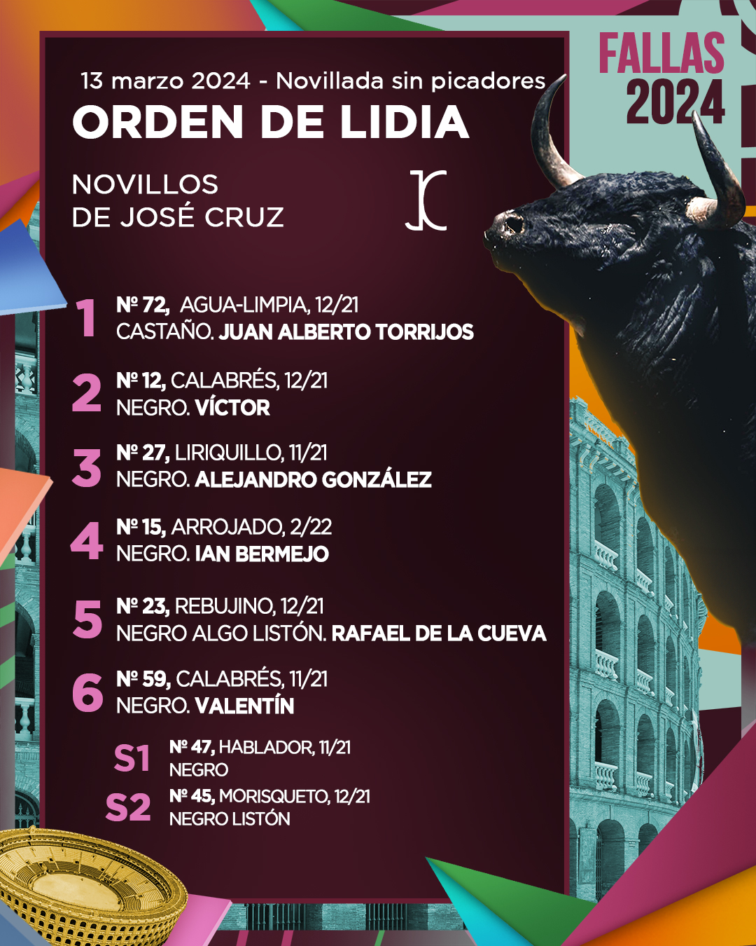 Los novillos de José Cruz ya aguardan en los chiqueros de la Plaza de Toros de Valencia tras el correspondiente sorteo. A las 17h. se lidiará la novillada sin picadores, tercera de abono, con la que se retoma hoy miércoles el ciclo josefino. Harán el paseíllo Juan Alberto Torrijos (Valencia), Víctor (Arles), Alejandro González (Albacete), Ian Bermejo (Castellón), Rafael de la Cueva (Escuela Yiyo) y Valentín (Nimes).