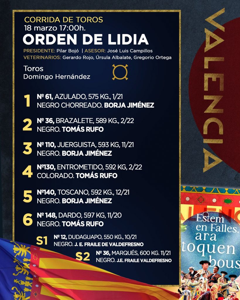 Seis toros de Domingo Hernández ya se encuentran en los chiqueros de la Plaza de Toros de Valencia para la novena de abono de la Feria Taurina de Fallas. El festejo, que comenzará a las 17:00 horas, reunirá a la afición valenciana en torno a un esperado mano a mano entre Borja Jiménez y Tomás Rufo.