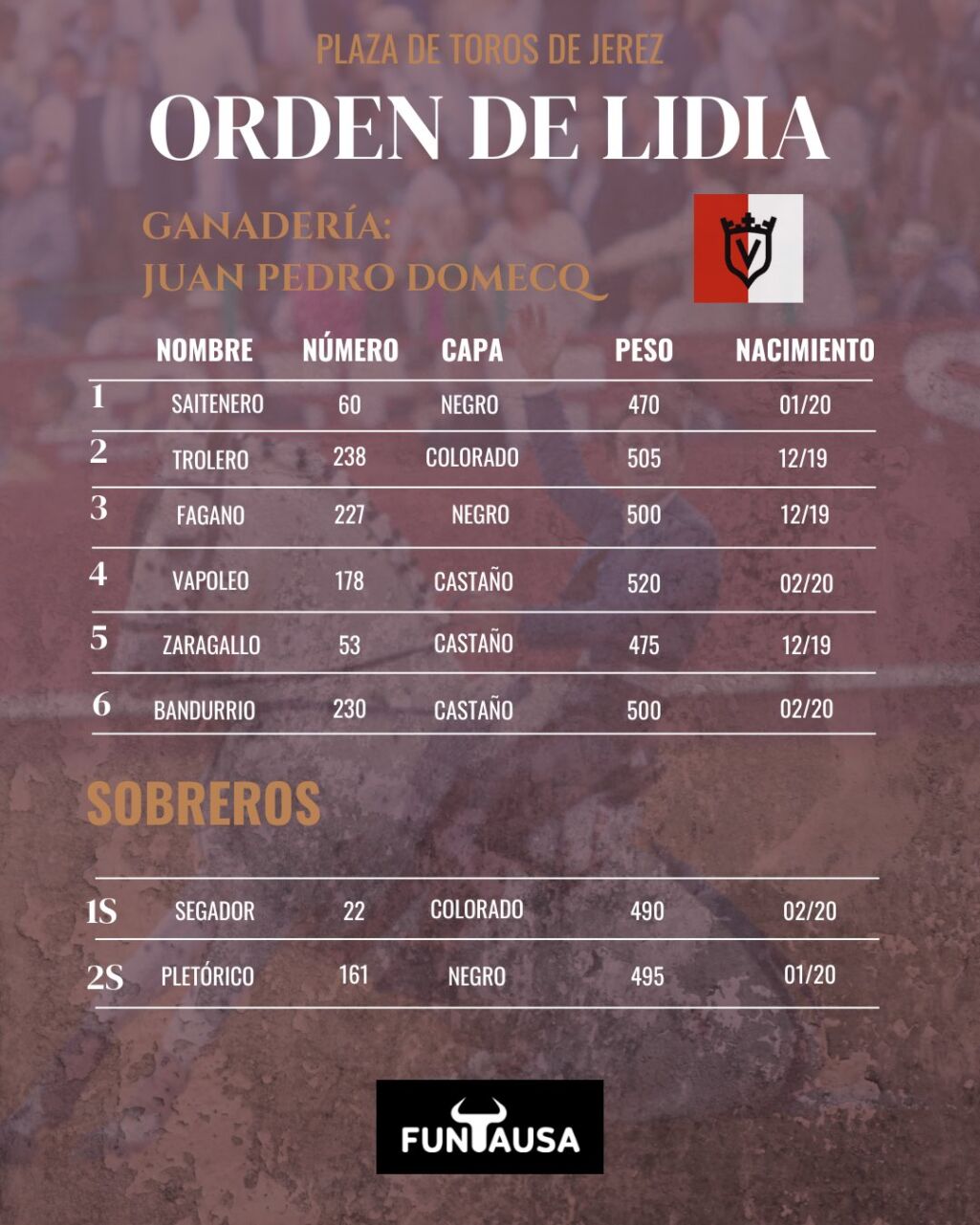 Los toros de Juan Pedro Domecq para la corrida que cierra la Feria de Jerez ya han sido sorteados y enchiquerados. El cartel está compuesto por Morante de la Puebla, Sebastián Castella y José María Manzanares.