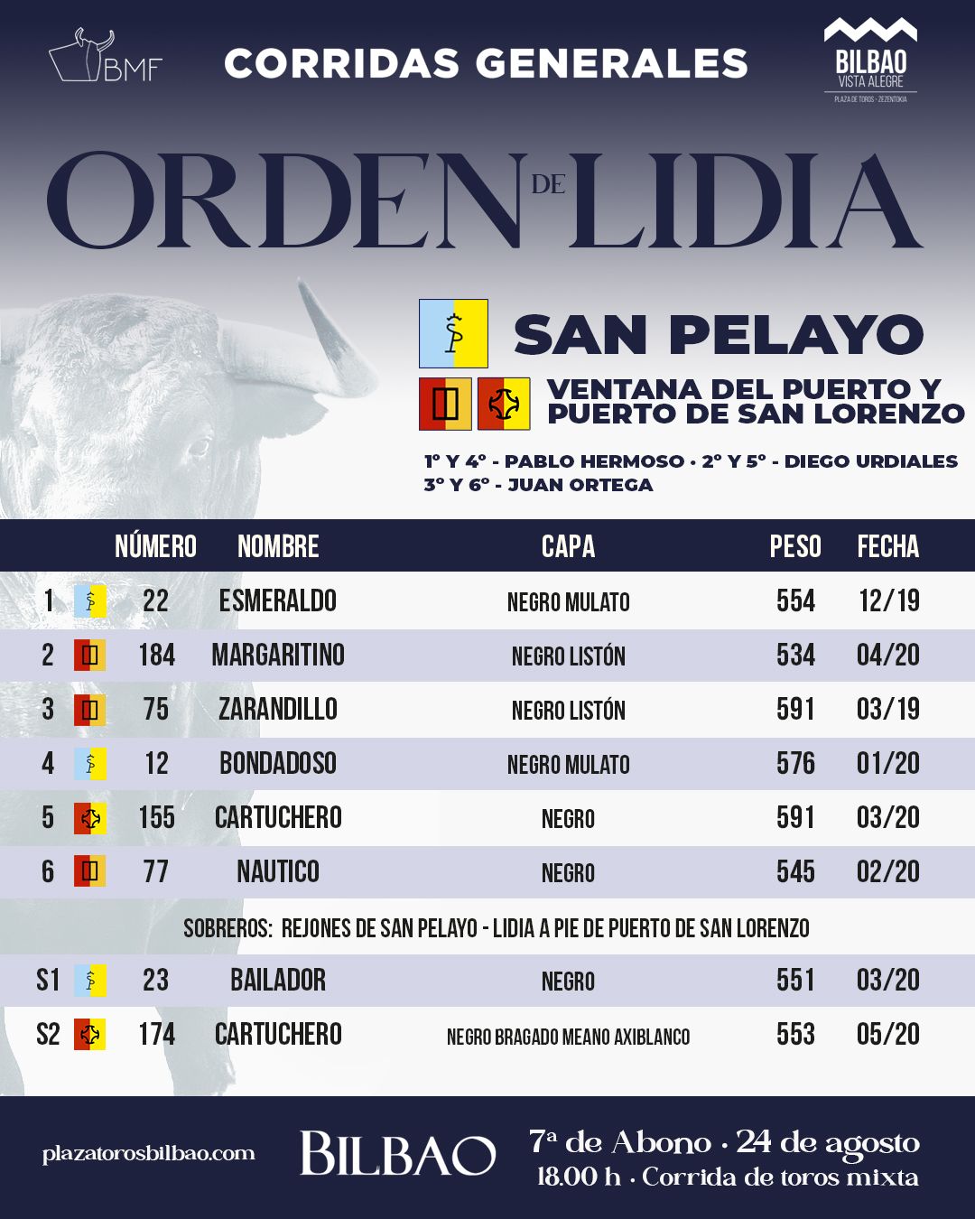 Los toros de San Pelayo, para rejones, y de La Ventana del Puerto y Puerto de San Lorenzo ya han sido sorteados para ser lidiados en el séptimo festejo de abono de Bilbao.