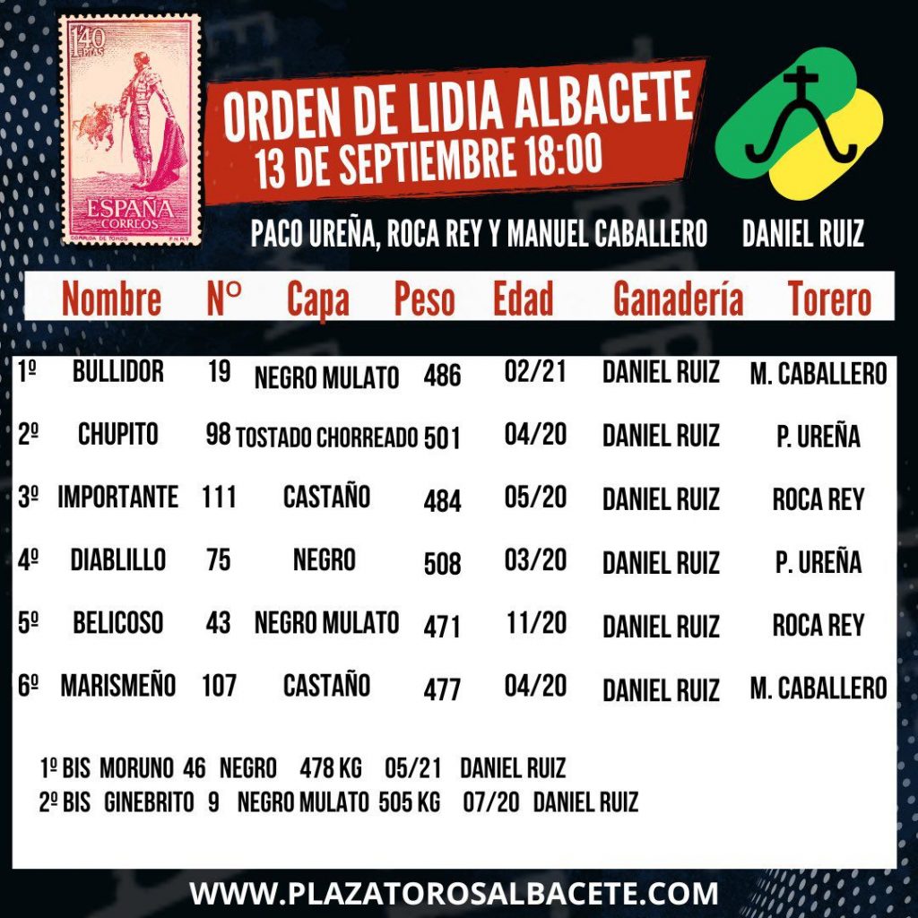 Este sábado, en la sexta de la Feria de los Llanos de Albacete, ya han quedado sorteados y enchiquerados los toros de Daniel Ruiz. Una tarde de máxima expectación en la que Manuel Caballero tomará la alternativa, con Paco Ureña como padrino y Roca Rey como testigo. El festejo dará comienzo a las 18:00 horas.
