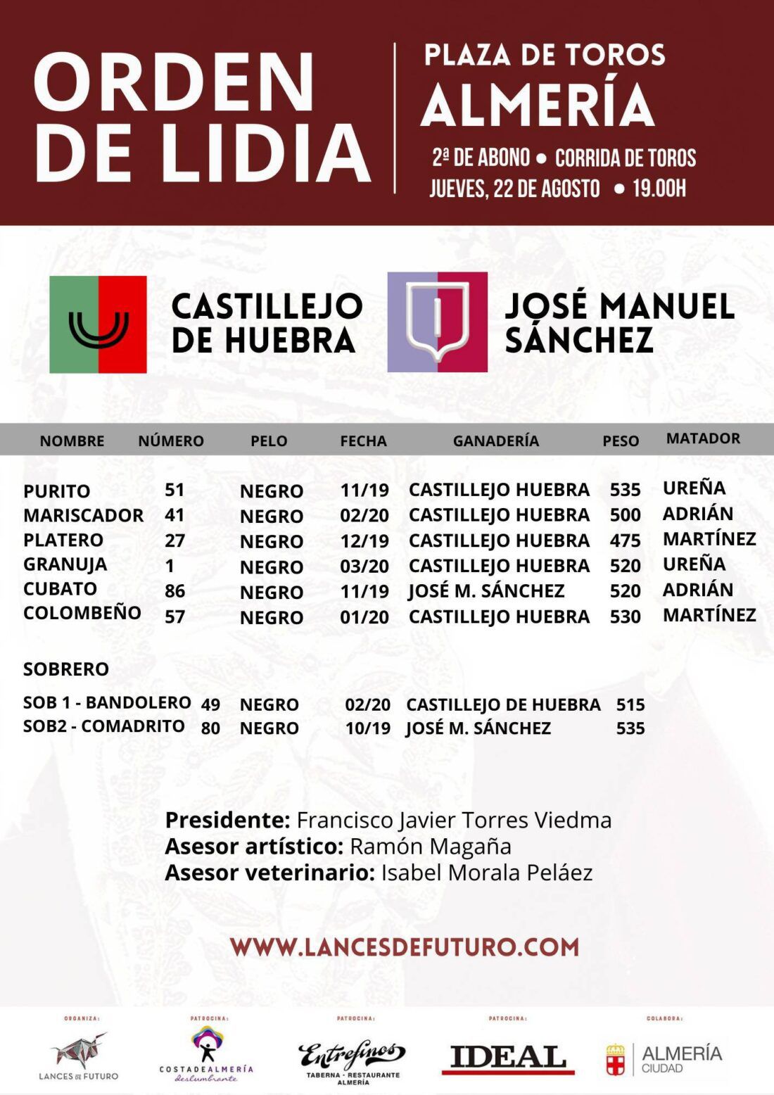 Cinco toros de Castillejo de Huebra y uno de José Manuel Sánchez para esta tarde en Almería