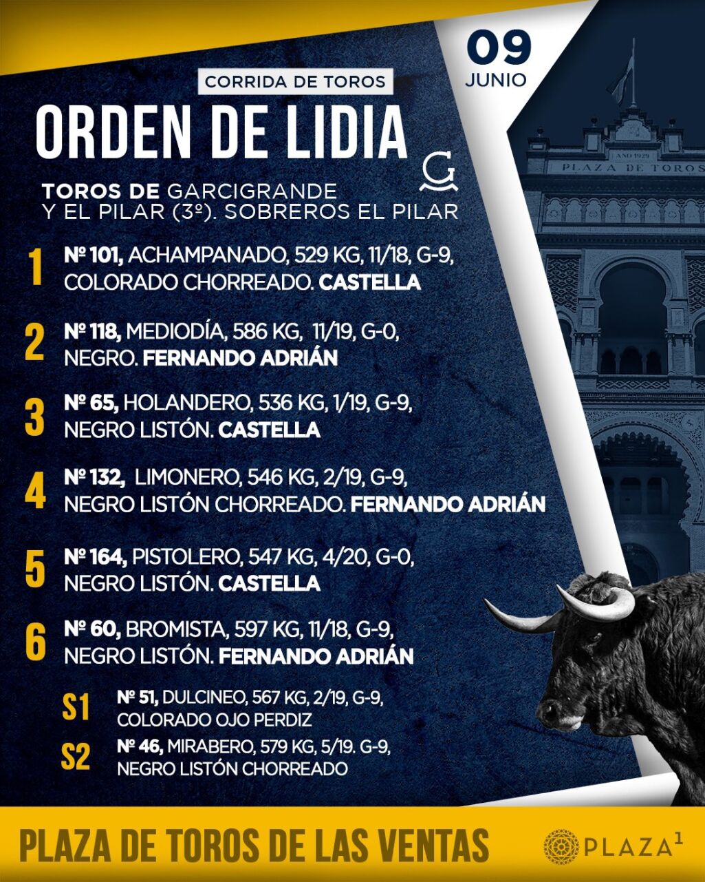 Cinco toros de Garcigrande y uno de El Pilar han sido enlotados, sorteados y enchiquerados a expensas de ser lidiados esta tarde en la Corrida de la Beneficencia de Madrid.