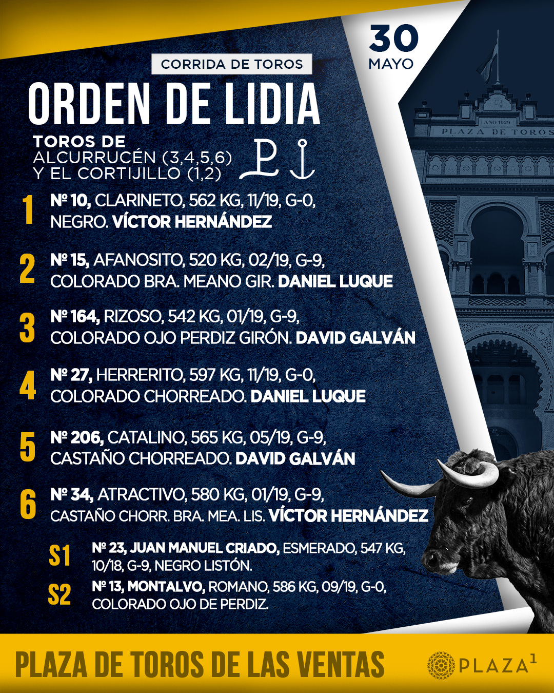 Sorteados y enchiquerados cuatro toros de Alcurrucén y dos de El Cortijillo para el decimoctavo festejo de abono de la Feria de San Isidro 2024.