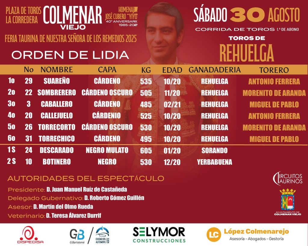 Este es el orden de lidia y la relación completa de las cuadrillas que intervendrán en el espectáculo y las autoridades que regirán el mismo: