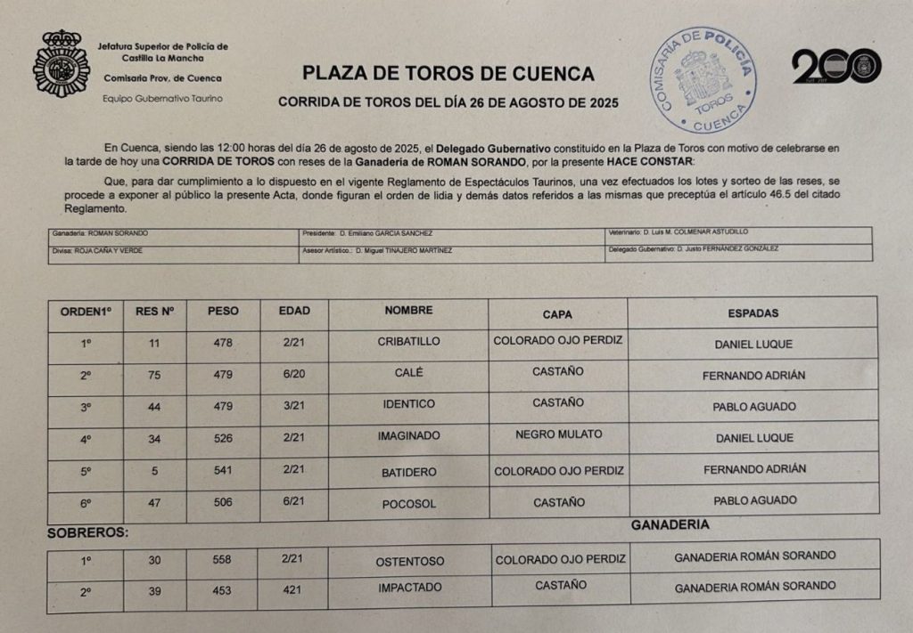 Ya han sido sorteados y enchiquerados los toros de Román Sorando que se lidiarán esta tarde en Cuenca a partir de las 18:30 horas.