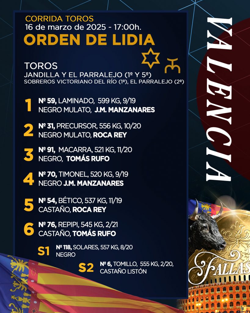 Tras el festejo de rejones matinal, los seis toros para una nueva cita de ‘No hay billetes’ en la Plaza de Toros de Valencia han sido enchiquerados. Cuatro toros de Jandilla y dos de El Parralejo en el orden de lidia de un festejo en el que harán el paseíllo, a las 17h., José María Manzanares, Roca Rey Tomás Rufo.
