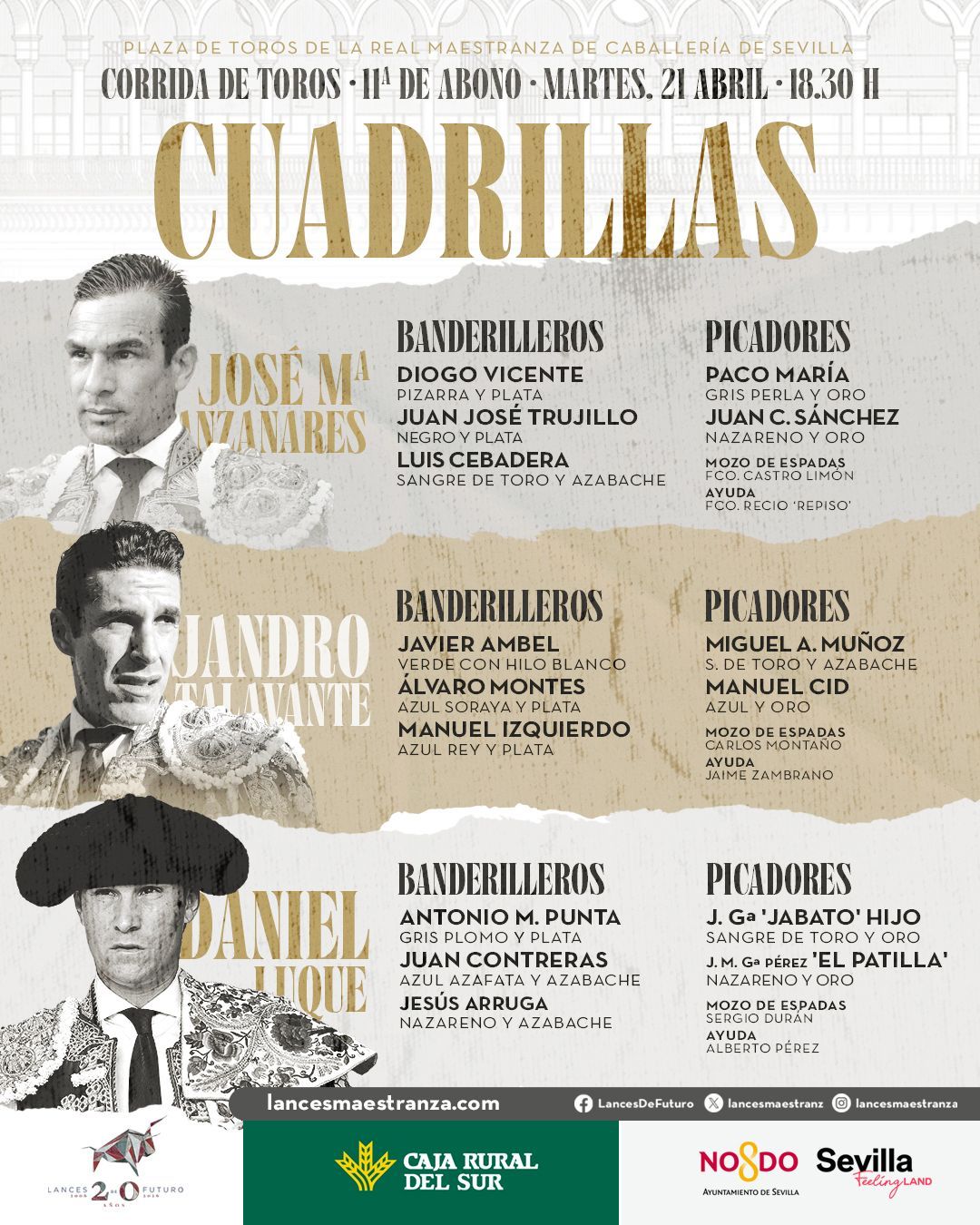 El cartel lo componen tres figuras del toreo como José María Manzanares, Alejandro Talavante y Daniel Luque, que harán el paseíllo a partir de las 18:30 horas en la Real Maestranza de Caballería de Sevilla.