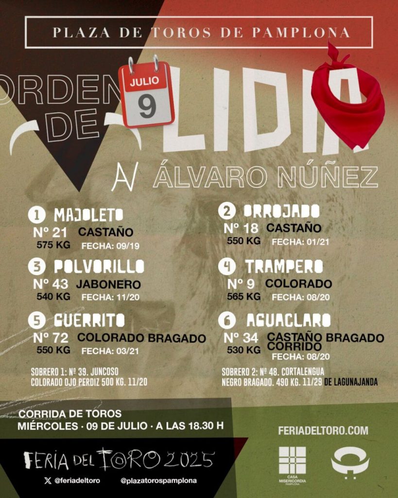 Este miércoles 9 de julio, la ganadería de Álvaro Núñez debutará en la Feria del Toro de Pamplona. Tras protagonizar un encierro veloz y lleno de emoción, los toros ya han sido sorteados y enchiquerados en los corrales de la plaza.