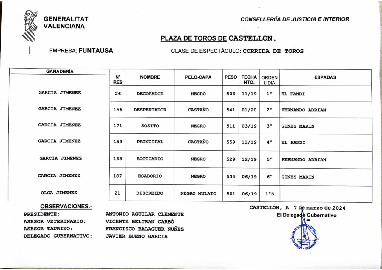 Los toros de Hnos. García Jiménez y Olga Jiménez, que serán lidiados en la tercera corrida de la Feria de la Magdalena de Castellón, ya han sido sorteados y enchiquerados. La terna está formada por El Fandi, Ginés Marín y Fernando Adrián.