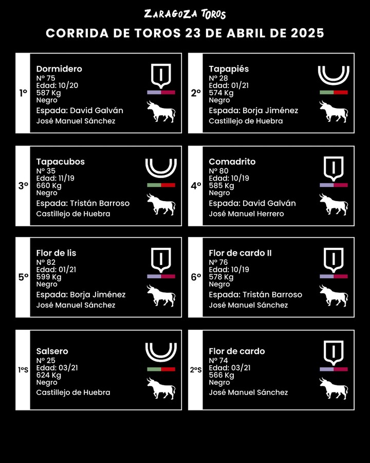Seis toros de las ganadería de Castillejo de Huebra y José Manuel Sánchez ya han sido sorteados y enchiquerados para el último festejo de la feria de San Jorge en Zaragoza.